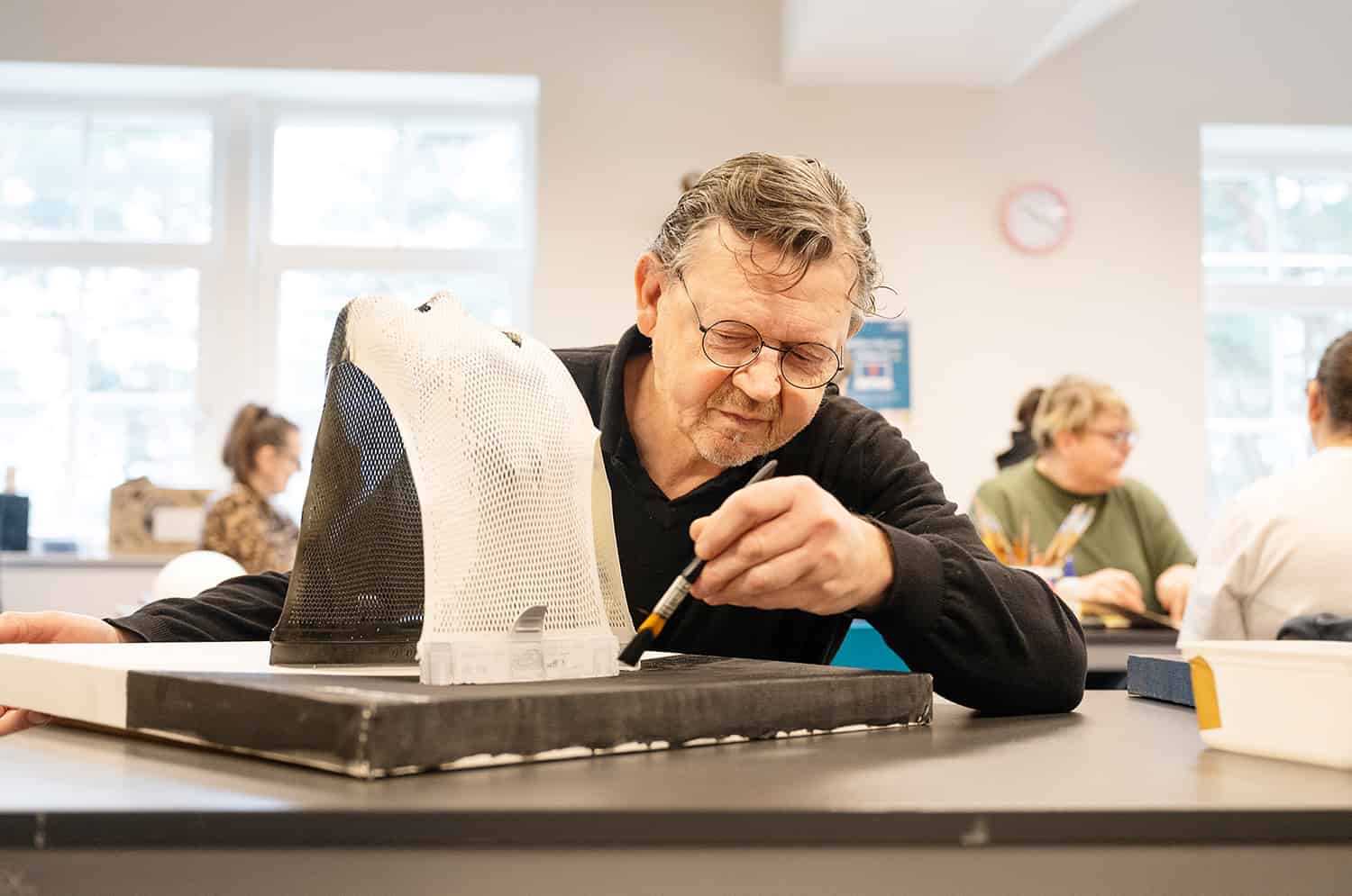De zoektocht naar een nieuwe plek in de maatschappij – na een leven lang hard werken – was voor Guy niet vanzelfsprekend. Hij volgt logopedie, krijgt thuisbegeleiding en neemt deel aan de activiteiten in ons dagondersteuningscentrum. Vanuit zijn enorme levenservaring helpt hij hier anderen die het moeilijk hebben. Hij tekent, schildert, maakt keramiek en herstelt meubelen.
